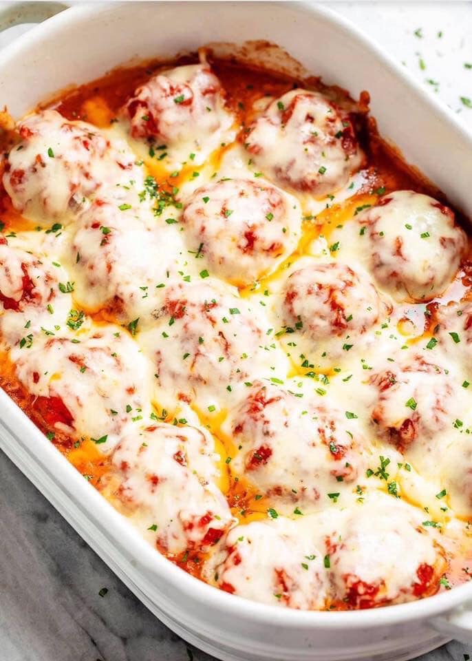 4. Top with the low carb Marinara sauce and shredded cheese and put the meatballs casserole back in the oven. Bake for an additional 5 to 10 minutes until the cheese has fully melted.