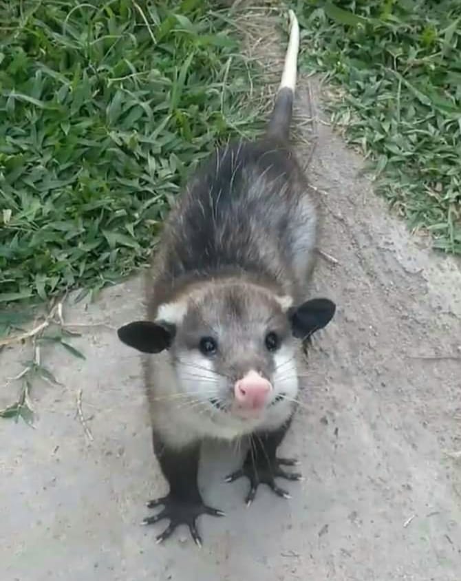 “One of the cutest beings on this planet, an opossum, also one of the most misunderstood. They are marsupials, they do not transmit rabies and are indispensable for pest control, they are naturally docile and gentle, and when scared they show their teeth and hiss to appear menacing, but when they are terrified they don’t “play” possum – they quite literally faint from fear – so do not harm them!”