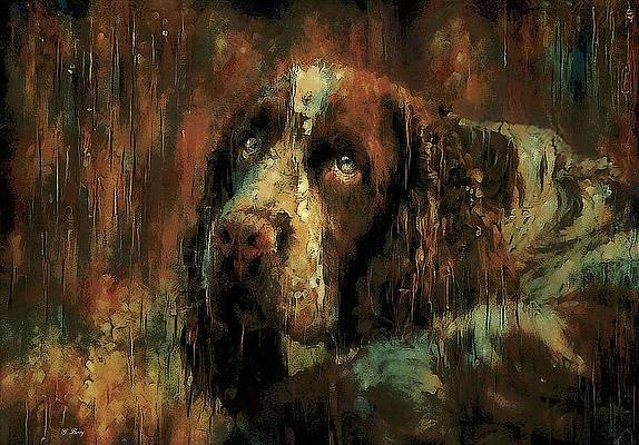 A stray dog left in the rain sat upright