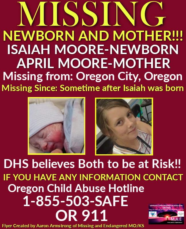 MISSING MOTHER AND NEWBORN!!!!! ISAIAH MOORE and APRIL MOORE. Believed to be at Risk! Missing from Oregon City, Oregon If you have any information as to their whereabouts please call the number posted or 911 Immediately! Please Share! https://www.oregonlive.com/…/newborn-mother-missing-from-or… Posted by: Aaron Armstrong