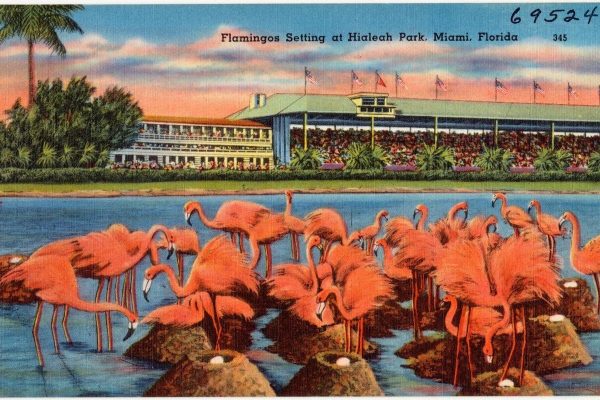 Hialeah Race Track postcard. Flamingos were imported from Cuba in 1934
