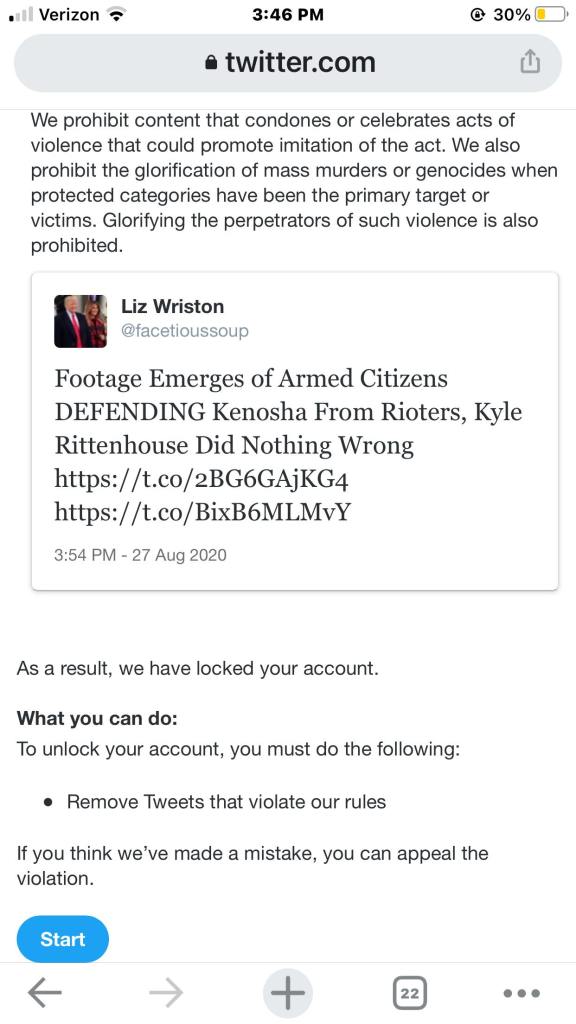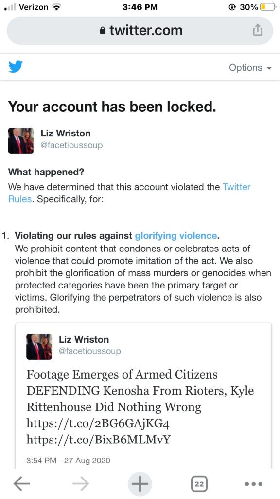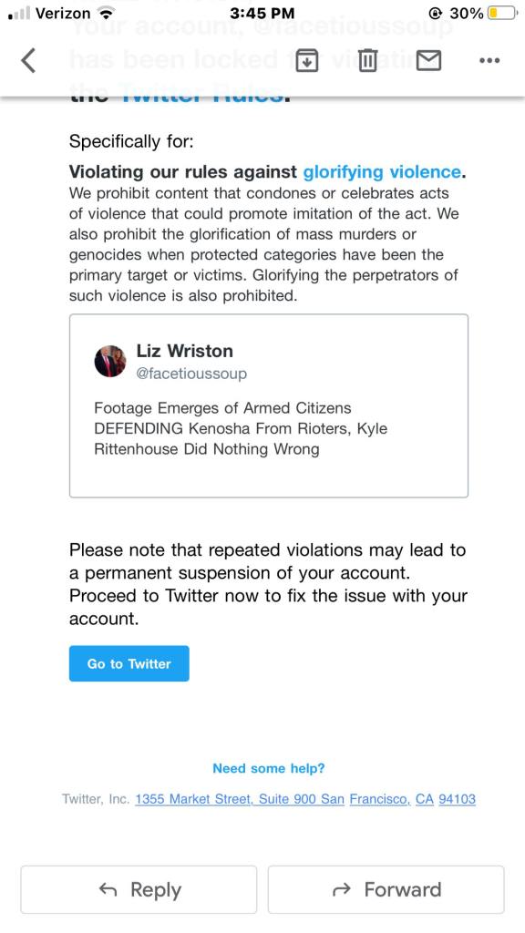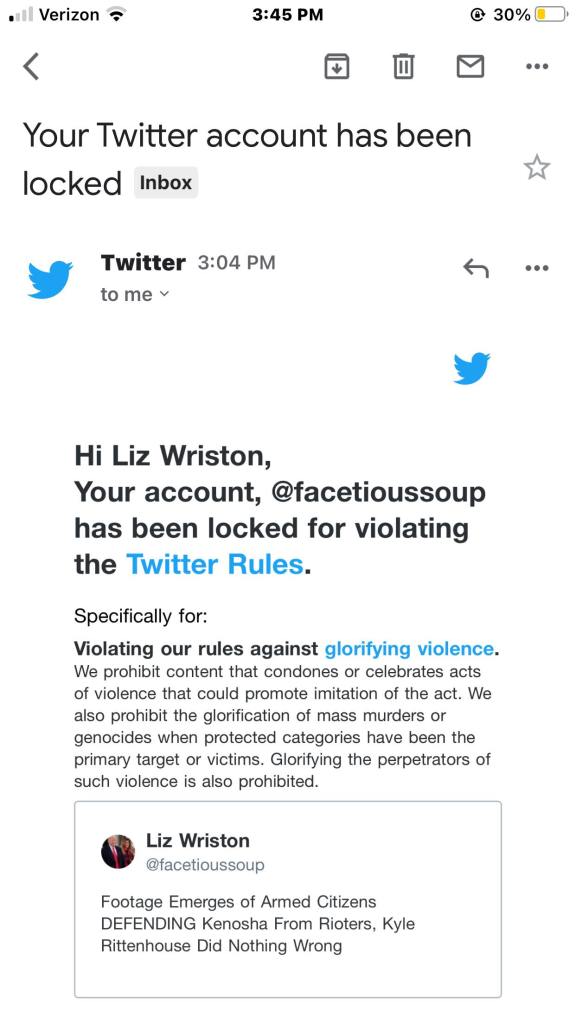 I got an email today that says my Twitter account has been suspended for glorifying violence. Just wow. I’ve already been banned on LinkedIn. Such is life I guess but this is free speech right?! How many more accounts out there truly violate these places rules but they are shutting us conservatives down.